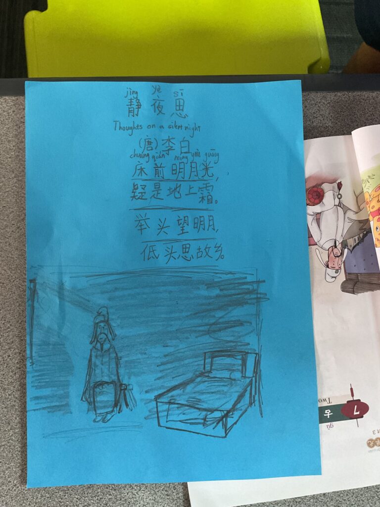 在课堂活动设计上,结合课文内容开展情景教学:在第六课《雪》中,学生分组进行小白兔、小猫和小狗的角色扮演;在第七课《古诗二首》中,引导学生以李白、王之涣的视角创作配图作品,并配合《静夜思》儿歌与手势舞,进一步加深了对古诗意境的理解,也提升了学习中文的兴趣。